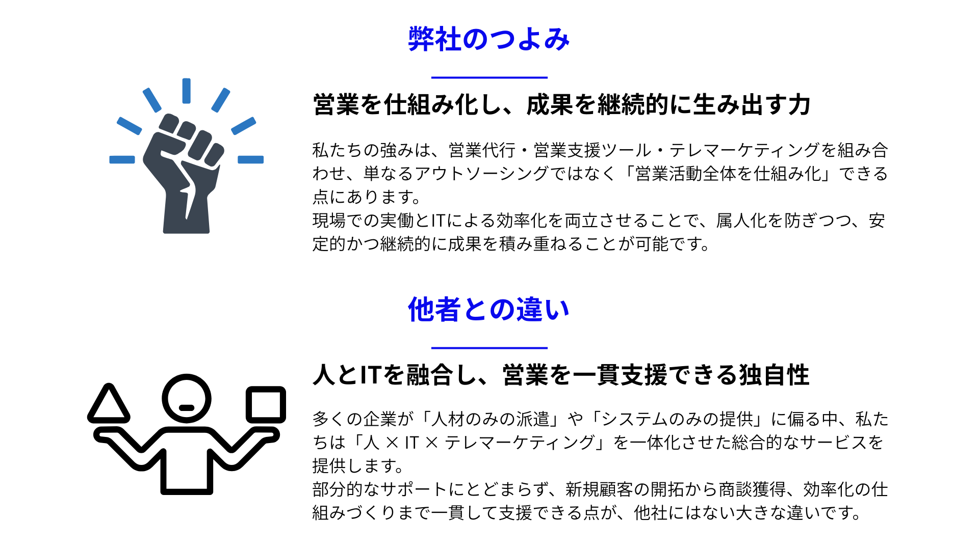 人の実行力とITの仕組み化で、部分最適ではなく 営業全体を一貫支援 します。