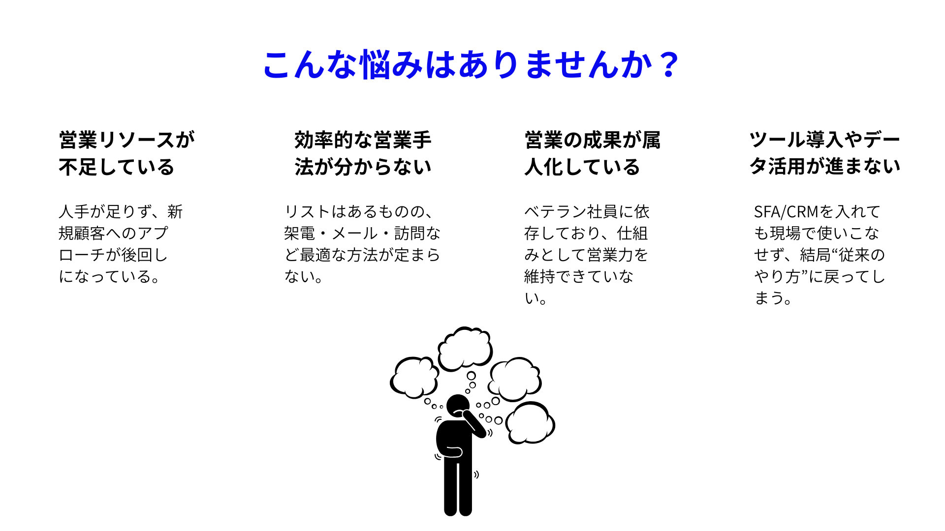 現場の課題に寄り添い、貴社の営業活動を加速させるパートナーとして伴走します。